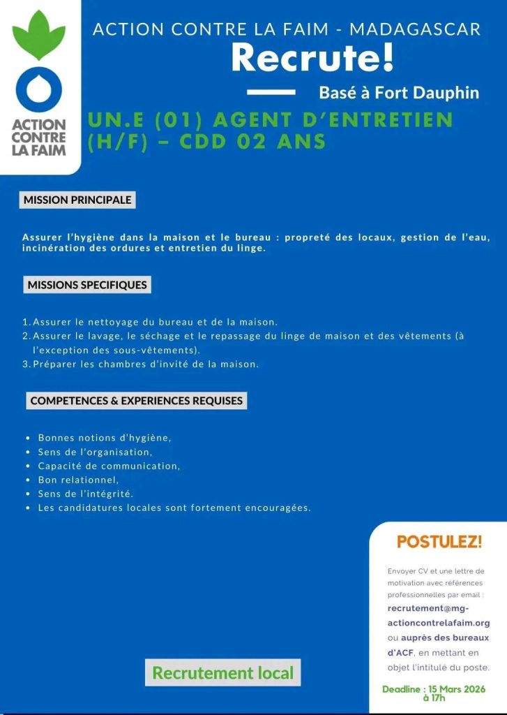 🔹 01 Agent d’entretien (recrutement local)