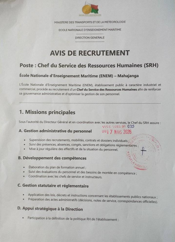 ENEM Mahajanga ( Ecole National d’enseignement Maritime) recrute: