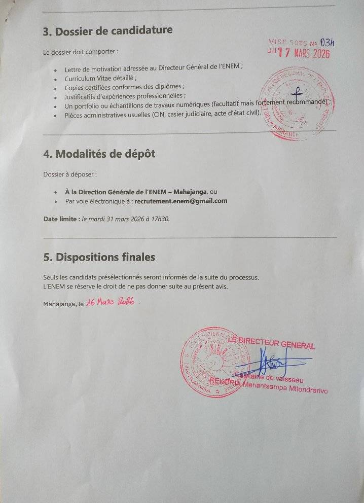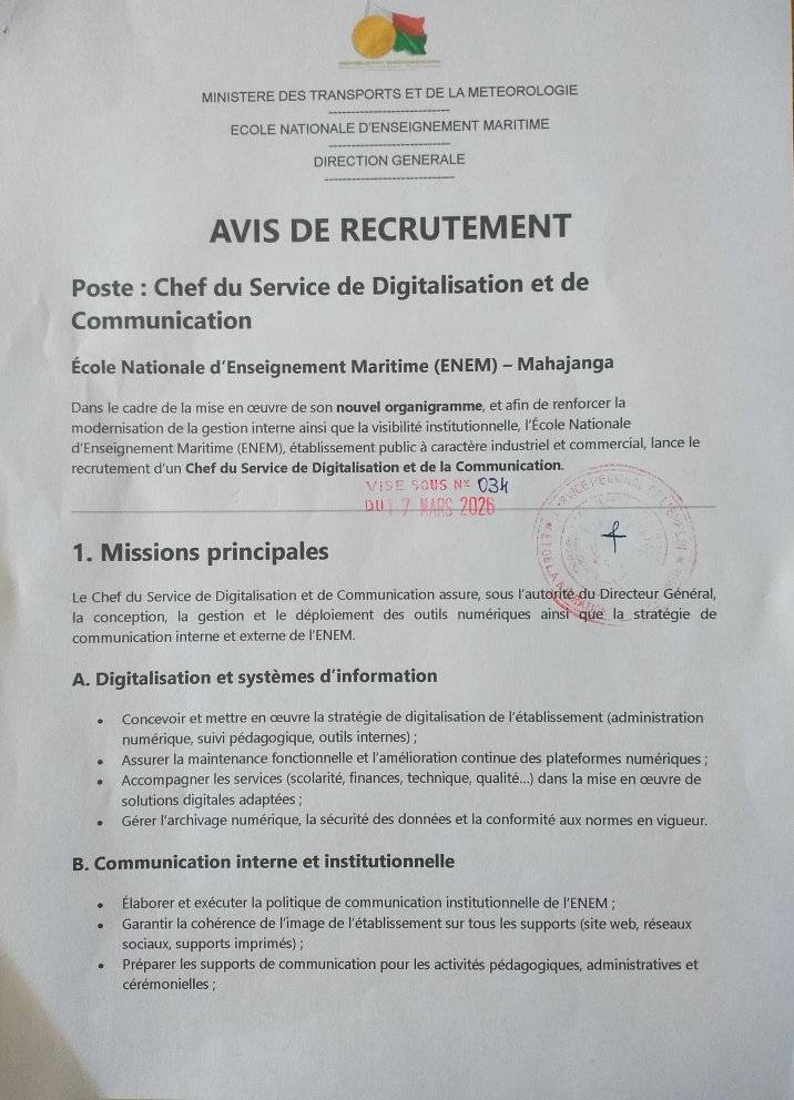 ENEM Mahajanga ( Ecole National d’enseignement Maritime) recrute: