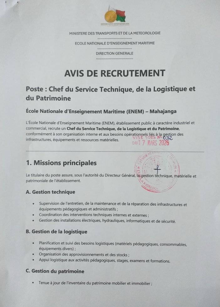 ENEM Mahajanga ( Ecole National d’enseignement Maritime) recrute: