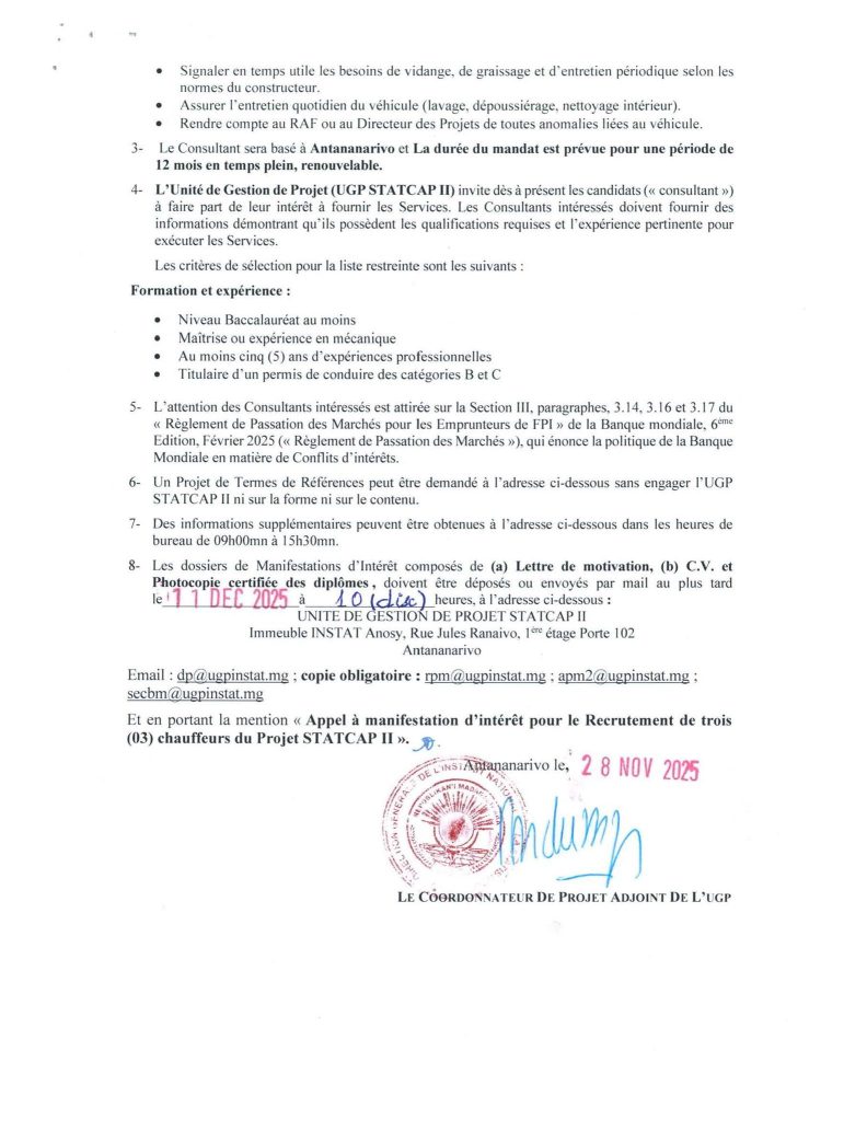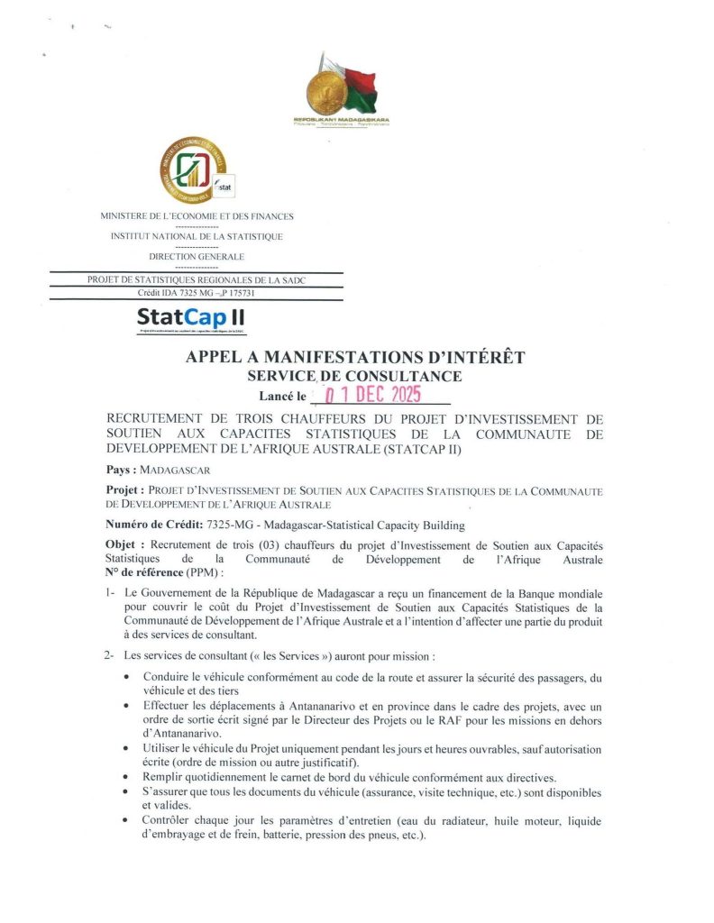 Objet : Recrutement de trois (03) chauffeurs du projet d’ investisse ment de Soutien aux Capacitรฉs Statistiques de la Communautรฉ de Dรฉveloppement de l’Afrique Australe