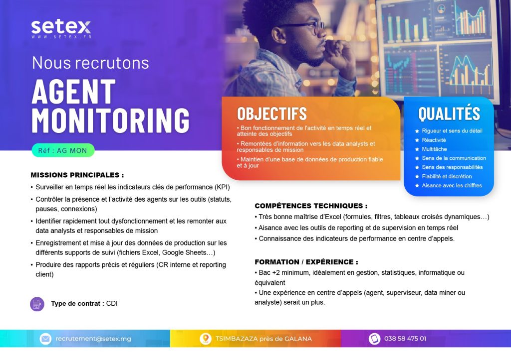 Envoyez votre dossier (CV à jour + lettre de motivation avec le poste souhaité) à recrutement@setex.mg