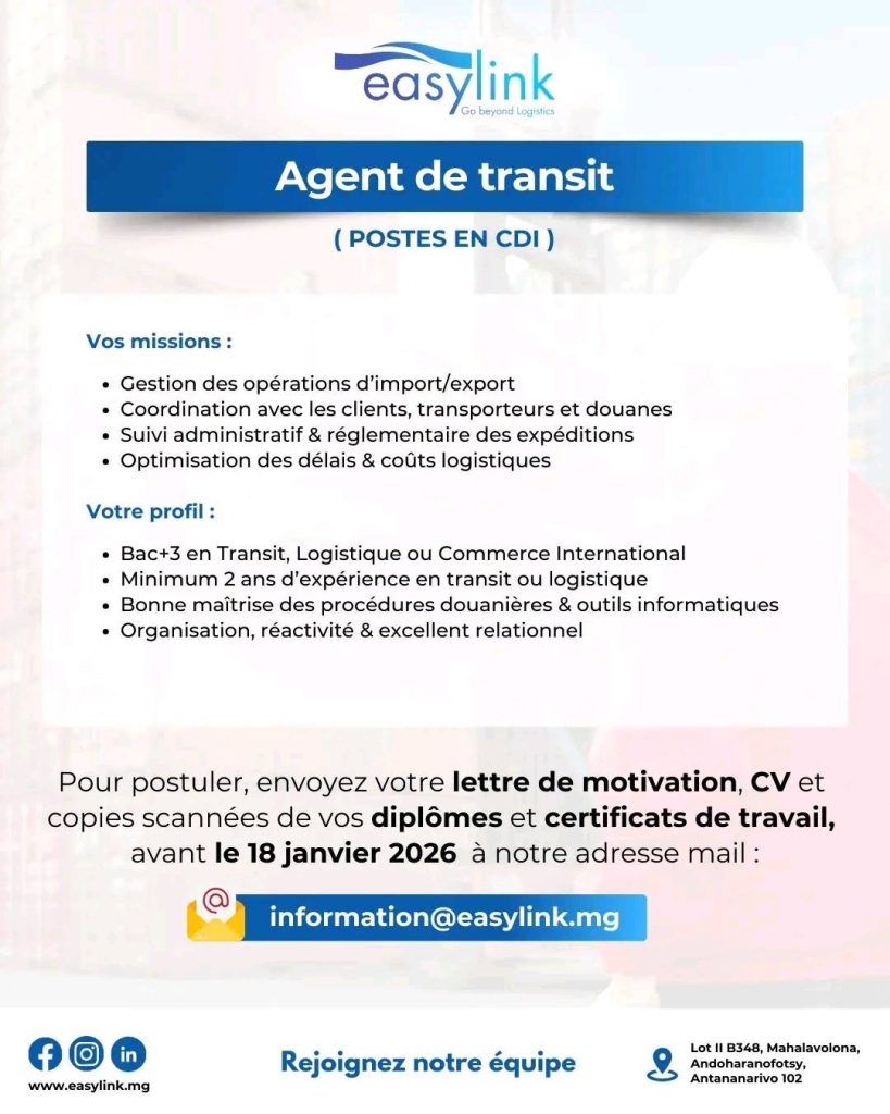 Envoyez votre CV à : information@easylink.mg et mettez en copie hello@easylink.mg