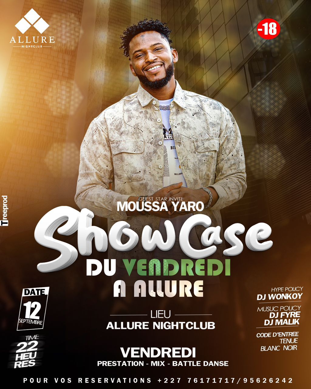 Marquer le dans vos agendas, le génialissime, Moussa Yaro, le Chouchou des belles Nanas de Niamey est à Allure Club & Lounge ce vendredi 12 septembre 2025, quand il sonnera 23H. Alors Public chic d’Allure soyez au rendez-vous. On va mettre le Outa