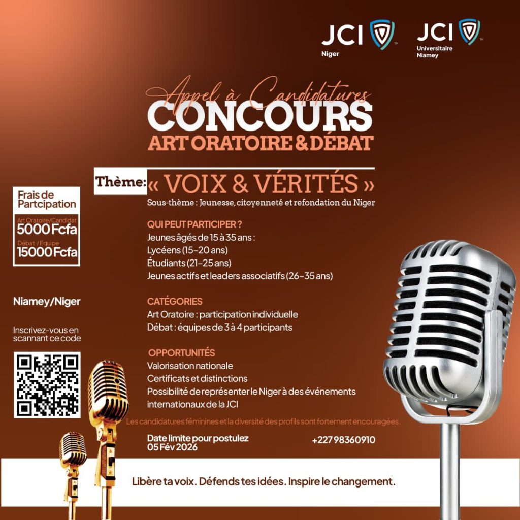 La JCI Niger, avec la JCI Universitaire Niamey, lance 𝐥𝐞 𝐜𝐨𝐧𝐜𝐨𝐮𝐫𝐬 𝐧𝐚𝐭𝐢𝐨𝐧𝐚𝐥 𝐝’𝐚𝐫𝐭 𝐨𝐫𝐚𝐭𝐨𝐢𝐫𝐞 𝐞𝐭 𝐝𝐞 𝐝𝐞́𝐛𝐚𝐭 𝐚𝐮𝐭𝐨𝐮𝐫 𝐝𝐮 𝐭𝐡𝐞̀𝐦𝐞 « 𝗩𝗼𝗶𝘅 & 𝗩𝗲́𝗿𝗶𝘁𝗲́𝘀 », 𝘀𝗼𝘂𝘀-𝘁𝗵𝗲̀𝗺𝗲” 𝗝𝗲𝘂𝗻𝗲𝘀𝘀𝗲, 𝗰𝗶𝘁𝗼𝘆𝗲𝗻𝗻𝗲𝘁𝗲́ 𝗲𝘁 𝗿𝗲𝗳𝗼𝗻𝗱𝗮𝘁𝗶𝗼𝗻 𝗱𝘂 𝗡𝗶𝗴𝗲𝗿” .