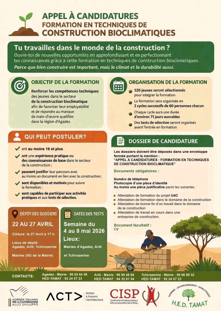 Une formation en techniques de construction bioclimatiques est ouverte aux jeunes d’Agadez, Arlit et Tchirozérine.