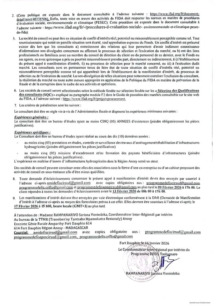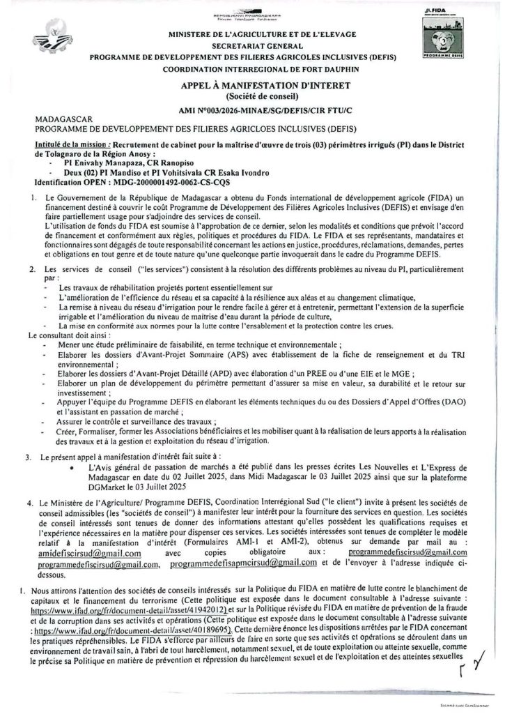 #MinistèreAgriculture#FIDA#ProgrammeDEFIS#AppelDOffres#BTP#GénieRural#Irrigation#Anosy#BureauDetudes#MINAE
