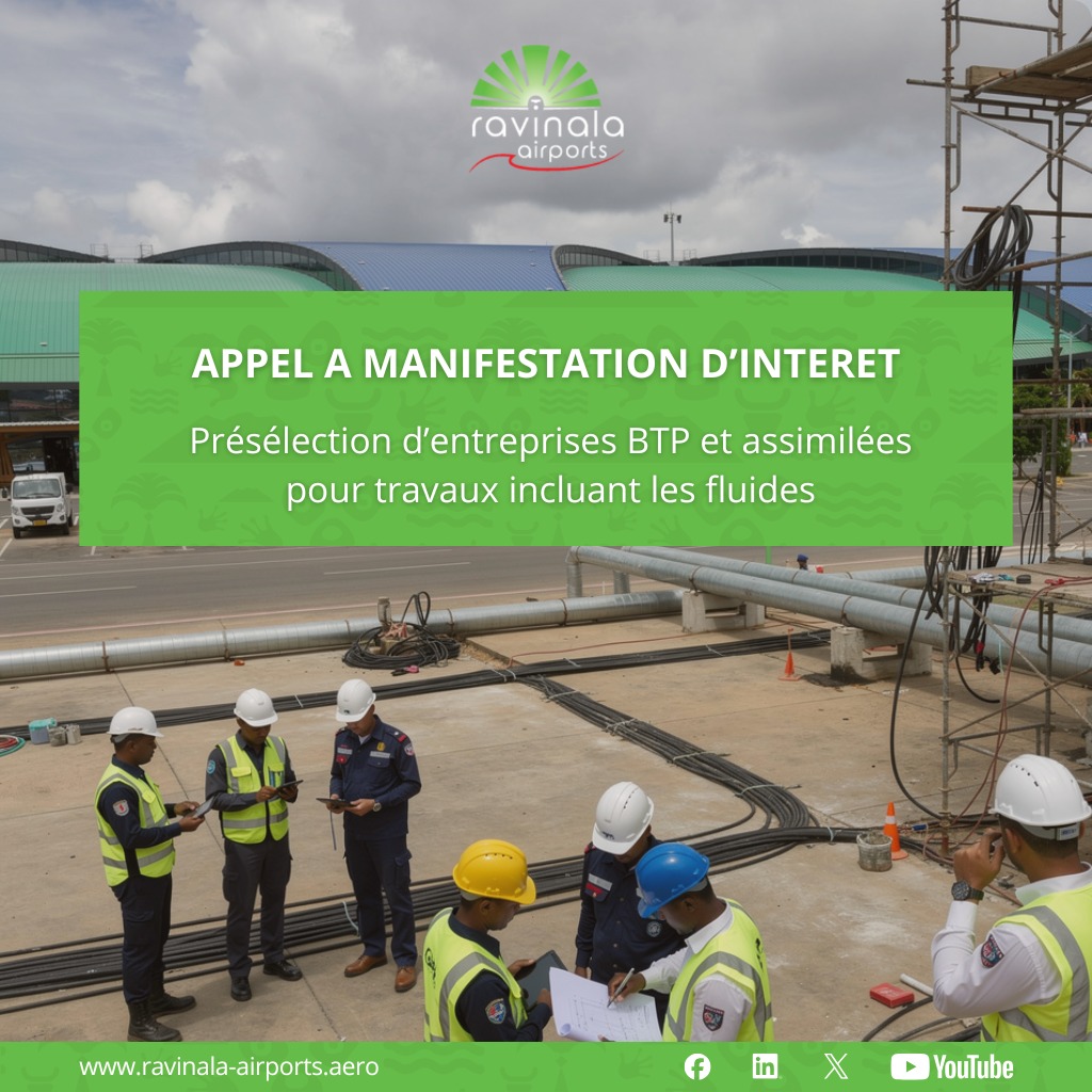 Ravinala Airports Madagascar lance le présent appel à manifestation d’intérêt dans le but de renforcer sa base de données d’entreprises pour les travaux et prestations de maintenance des infrastructures aéroportuaires des Aéroports Internationaux d’Antananarivo et de Nosy Be.