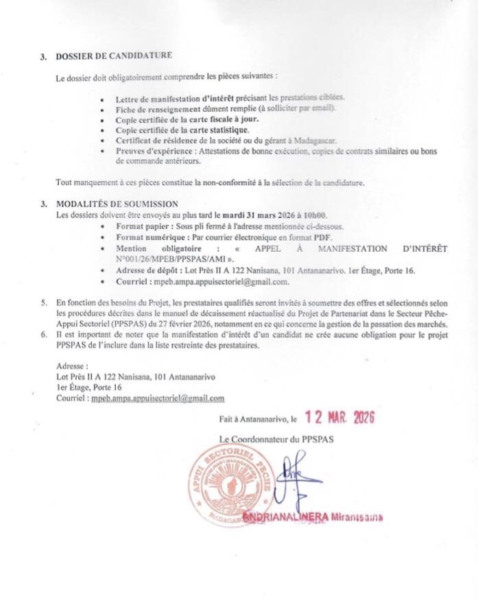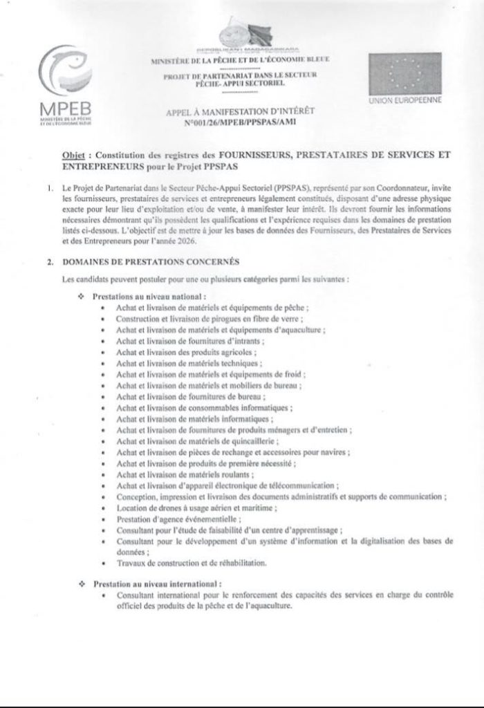 APPEL À MANIFESTATION D’INTÉRÊT – N°001/26/MPEB/PPSPAS/ AMI