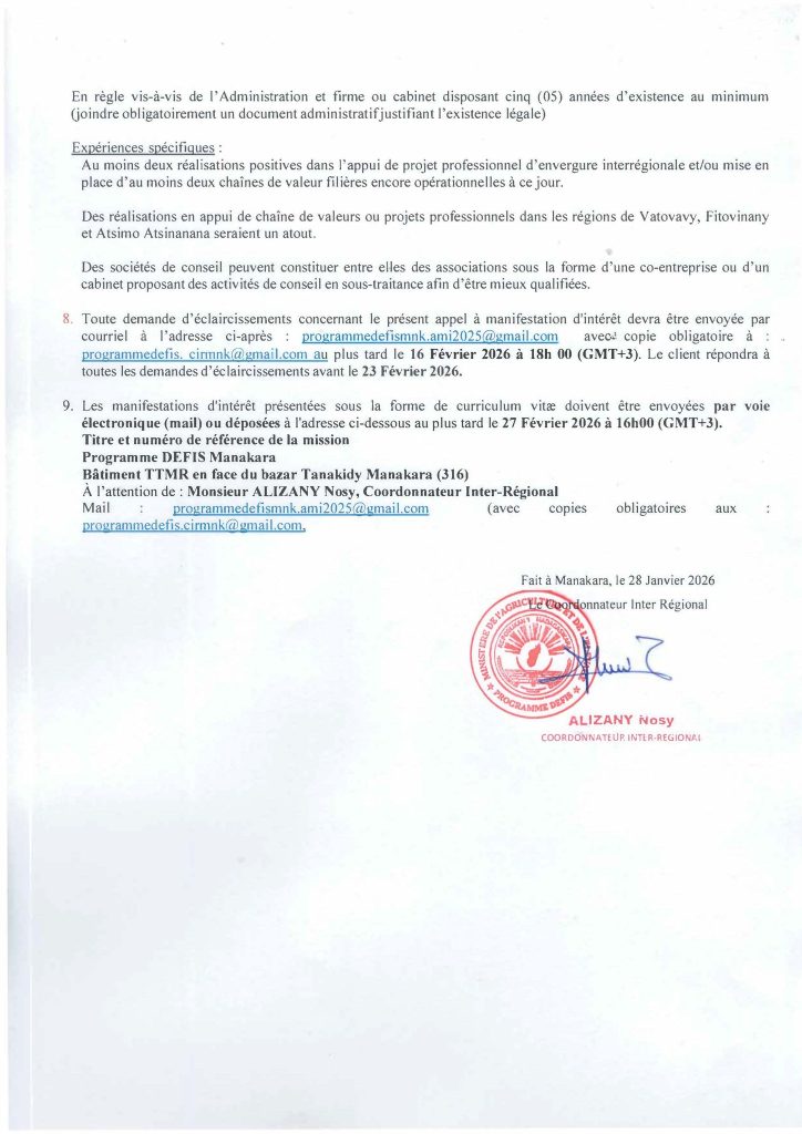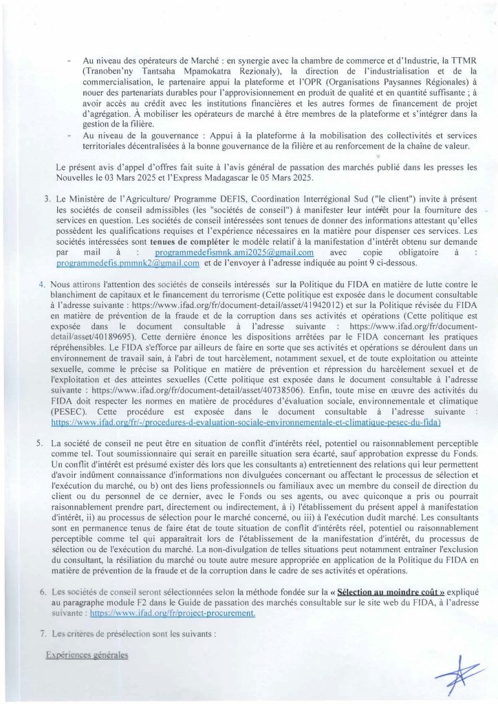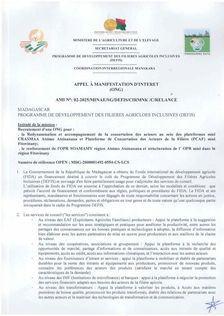 Dans le cadre du Programme de Développement des Filières Agricoles Inclusives (DEFIS), financé par le FIDA, le Ministère de l’Agriculture et de l’Élevage lance un Appel à Manifestation d’Intérêt pour le recrutement d’une ONG.