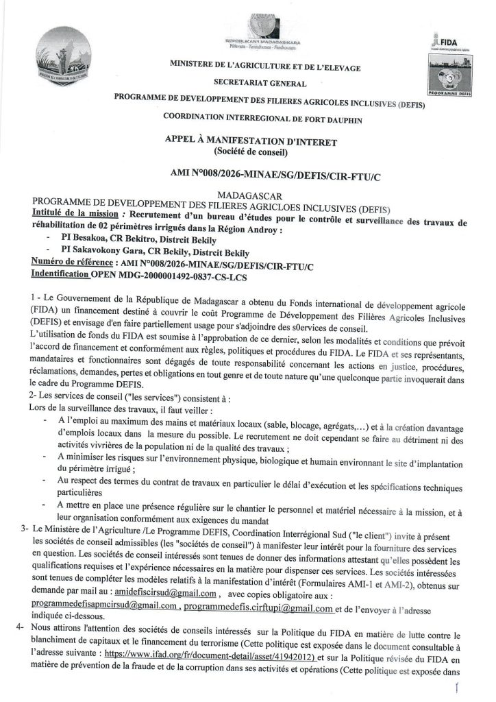 Le Ministère de l’Agriculture et de l’Élevage (MINAE), via le Programme DEFIS et sur financement du FIDA, lance un recrutement de Bureau d’Études partenaire pour transformer durablement l’agriculture dans le Sud.