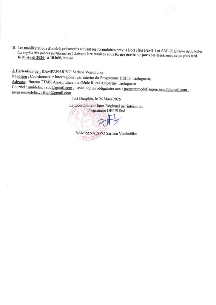 Ou dépôt physique au Bureau TTMR Anosy (Fort-Dauphin).