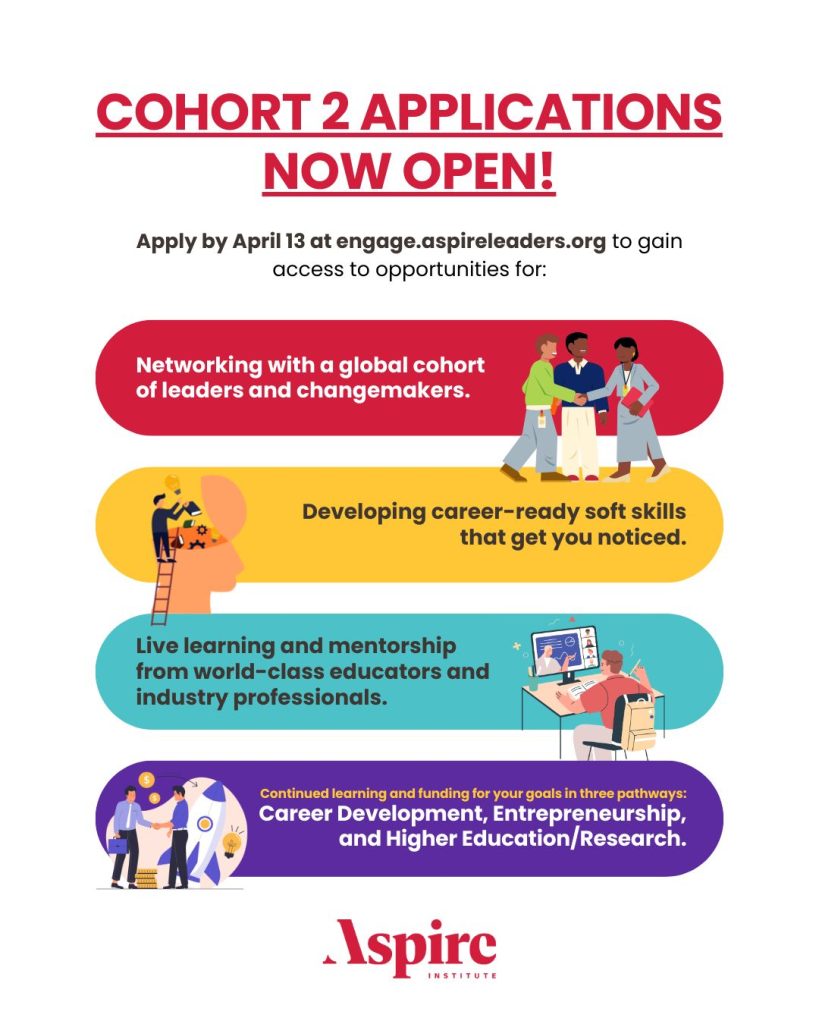 Le programme Aspire Leaders est un programme de leadership mondial en ligne 100% gratuit pour les étudiants universitaires de première génération et à revenu limité et les nouveaux diplômés (18-29) dans le monde entier.