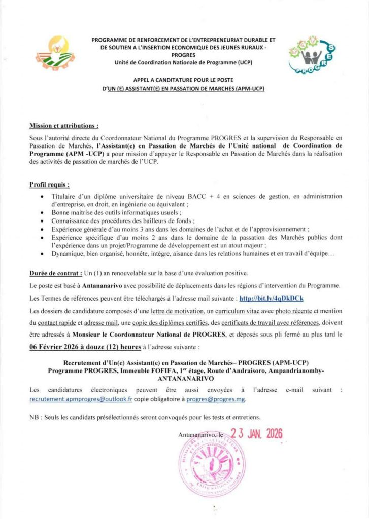 Le Programme PROGRES du Ministère de l’Agriculture et de l’Elevage, financé par le FIDA, recrute son Assistan(e) en passation de marchés