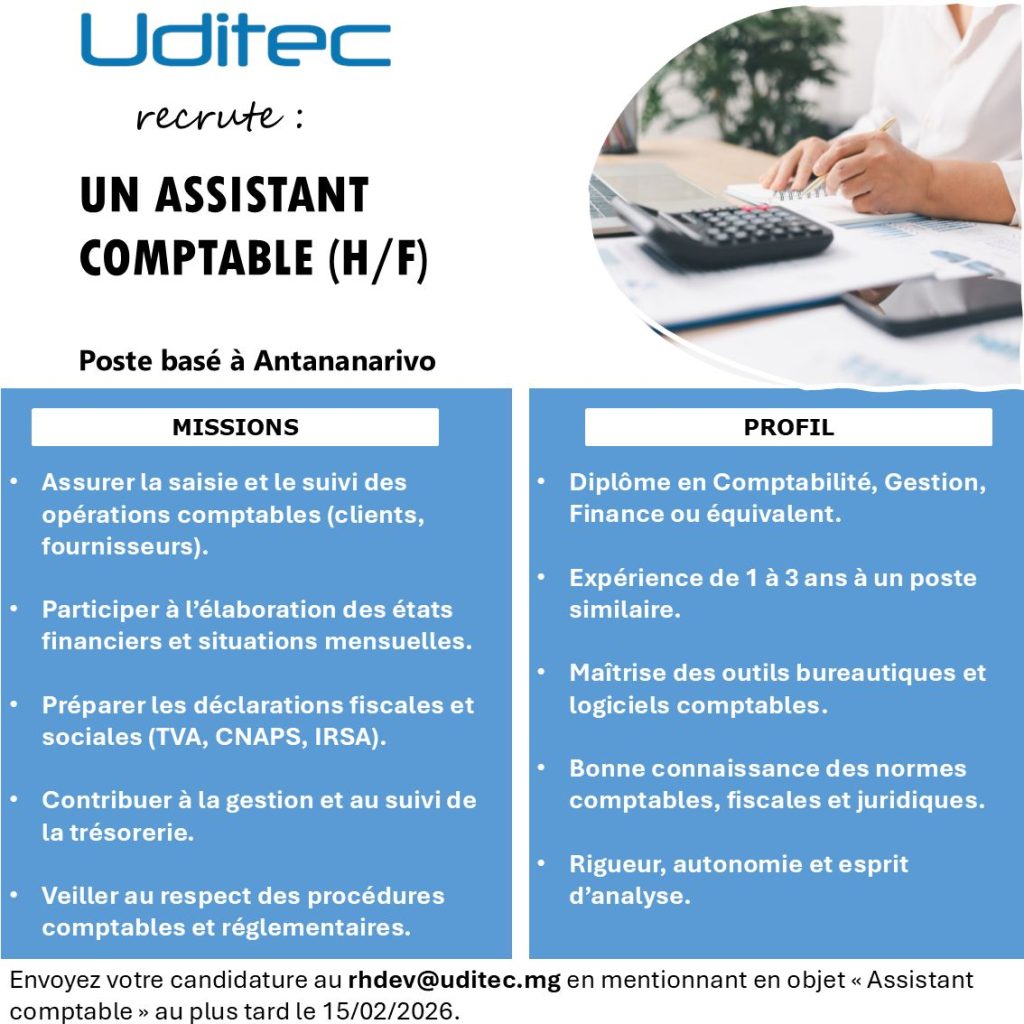 📩 Envoyez votre CV à rhdev@uditec.mg avec le nom du poste en objet.