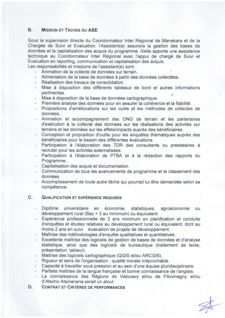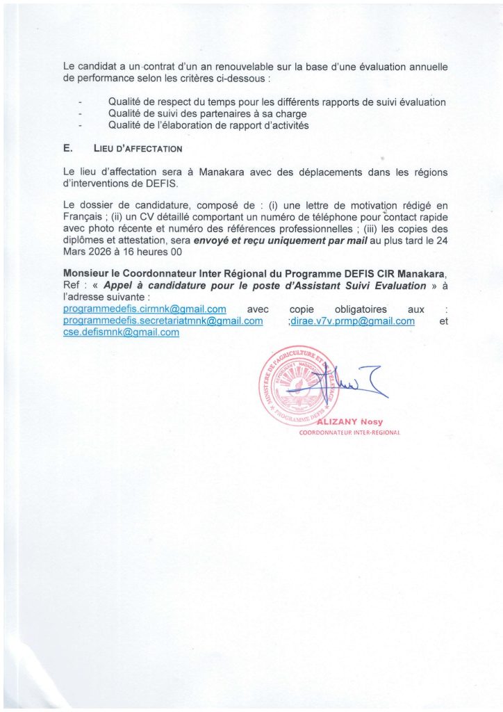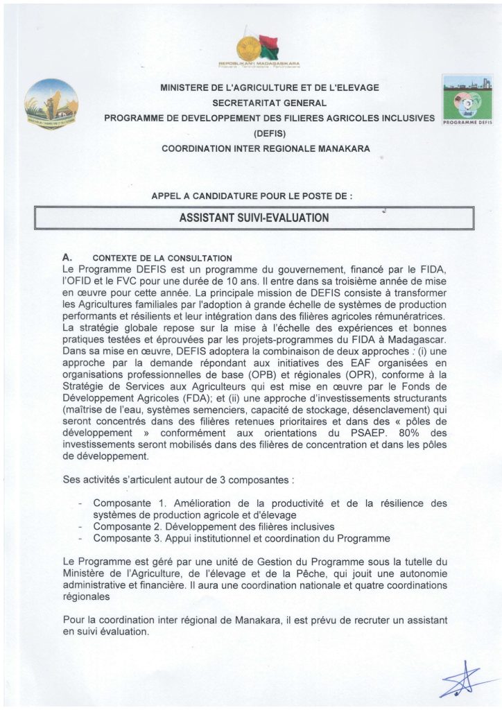 Le Ministère de l’Agriculture et de l’Élevage (MINAE), via le Programme DEFIS (Financement FIDA), recherche son futur Assistant Suivi-Évaluation (ASE) pour la Coordination Inter-Régionale de Manakara.
