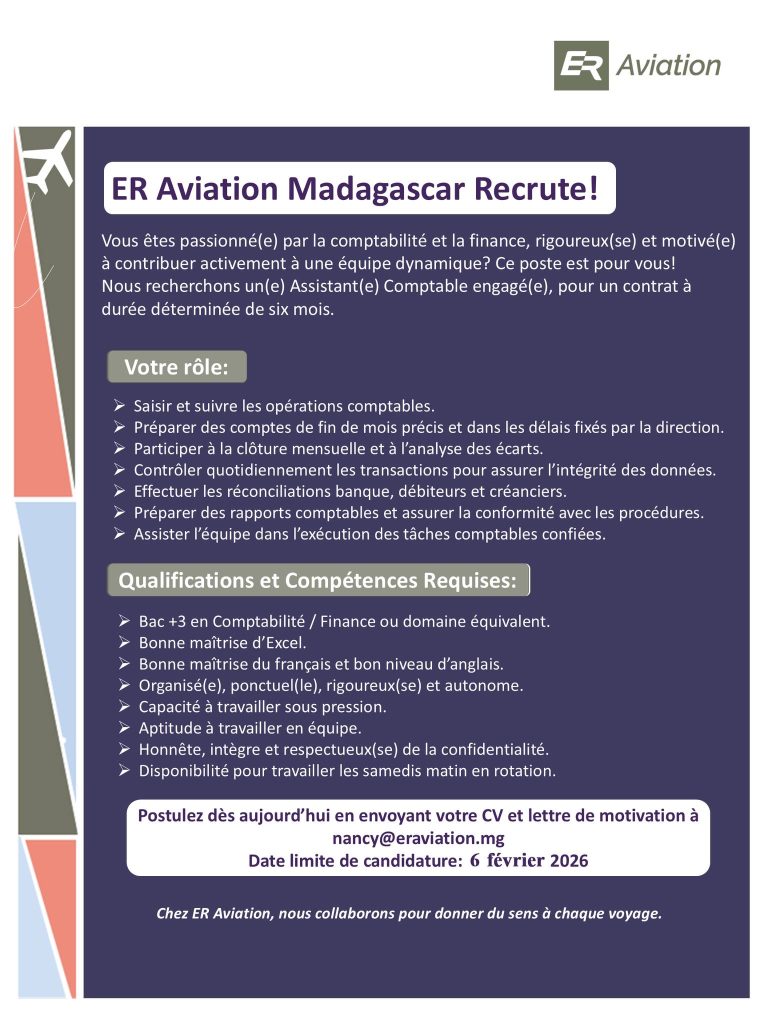 ER Aviation Madagascar recherche un(e) 𝐀𝐬𝐬𝐢𝐬𝐭𝐚𝐧𝐭(𝐞) 𝐂𝐨𝐦𝐩𝐭𝐚𝐛𝐥𝐞 engagé(e) dans le cadre d’un contrat à durée déterminée de 6 mois.