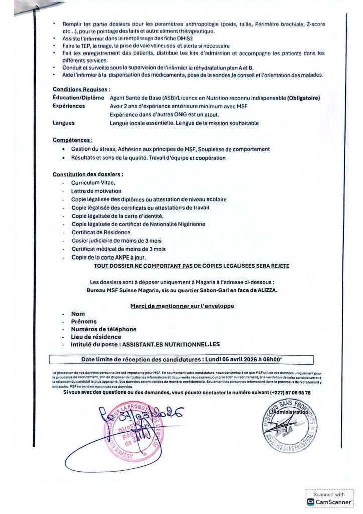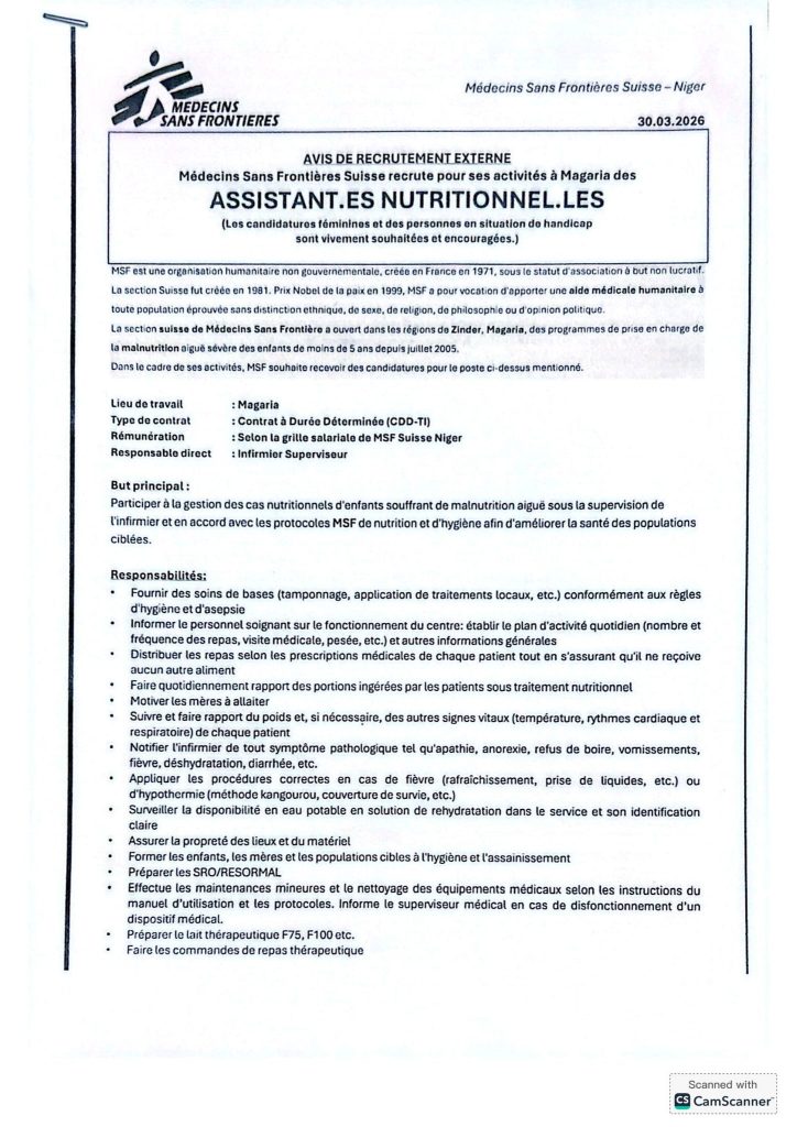 Dans le cadre de ses activités, MSF souhaite recevoir des candidatures pour le poste ci-dessus mentionné.