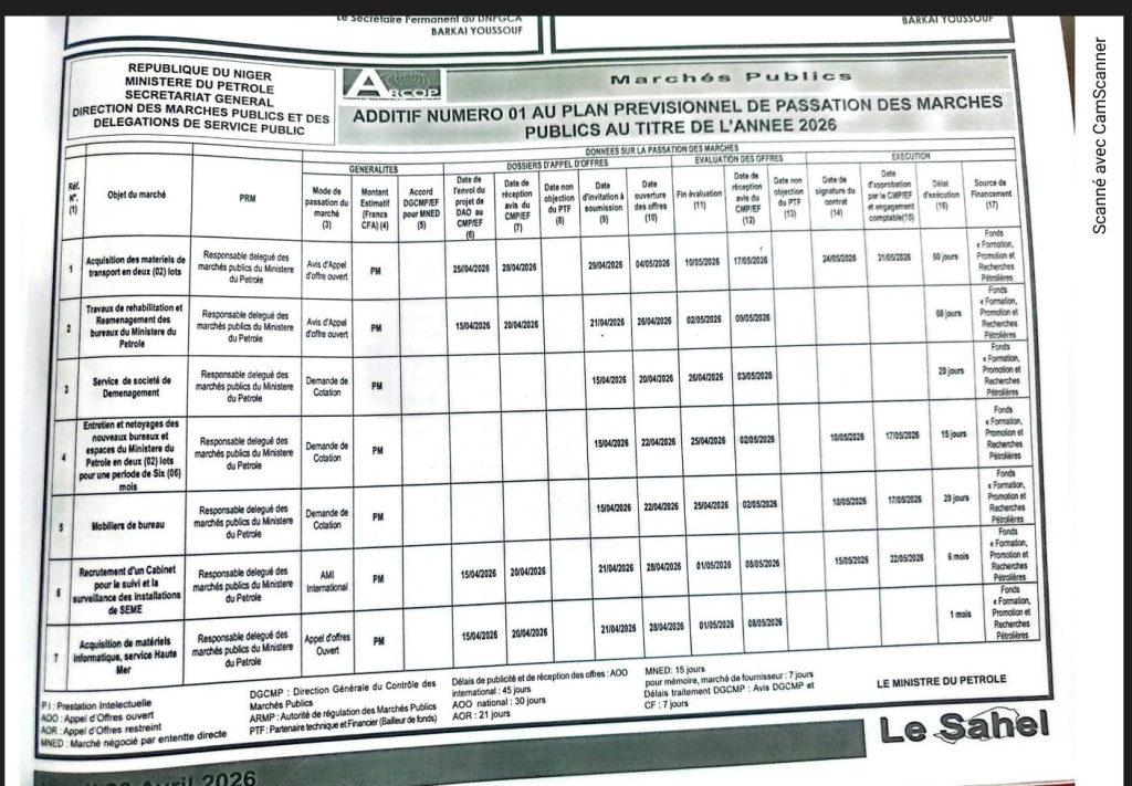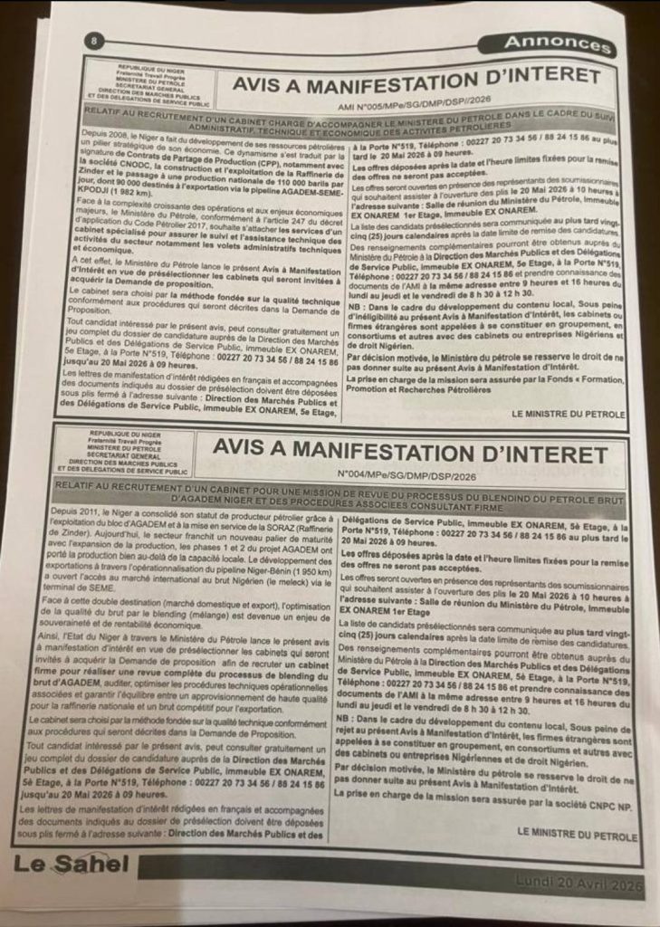 Conscients de ces enjeux à fort impact économique, le Ministère du Pétrole a publié dans le quotidien, le sahel du lundi 20 Avril 2026 deux avis à manifestation d’intérêt en vue de la présélection des cabinets qui seront invités à acquérir la demande de propositions.