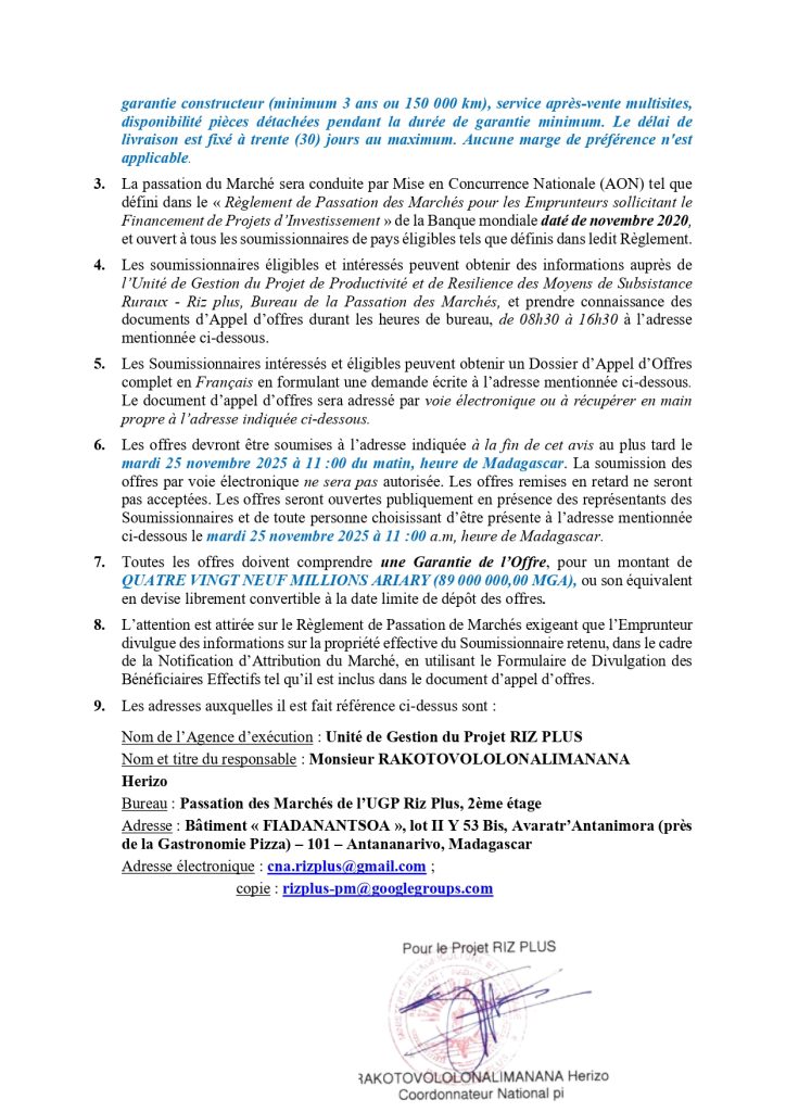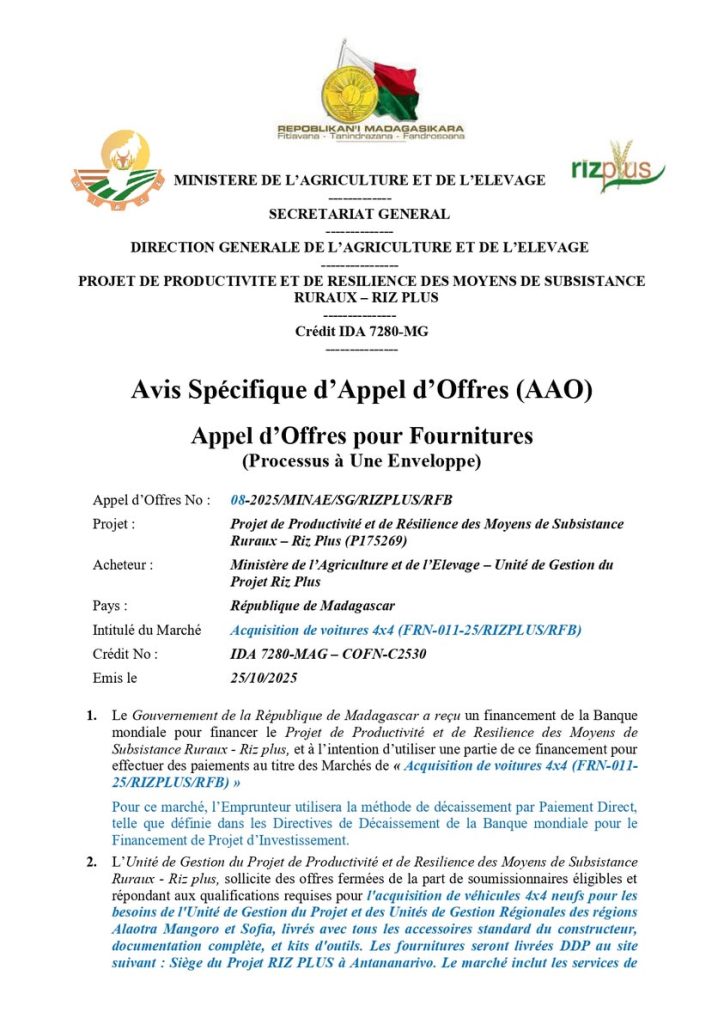 Date limite des dépôts de candidatures : Mardi 25 Novembre 2025 à 11H00 (Heure de Madagascar)