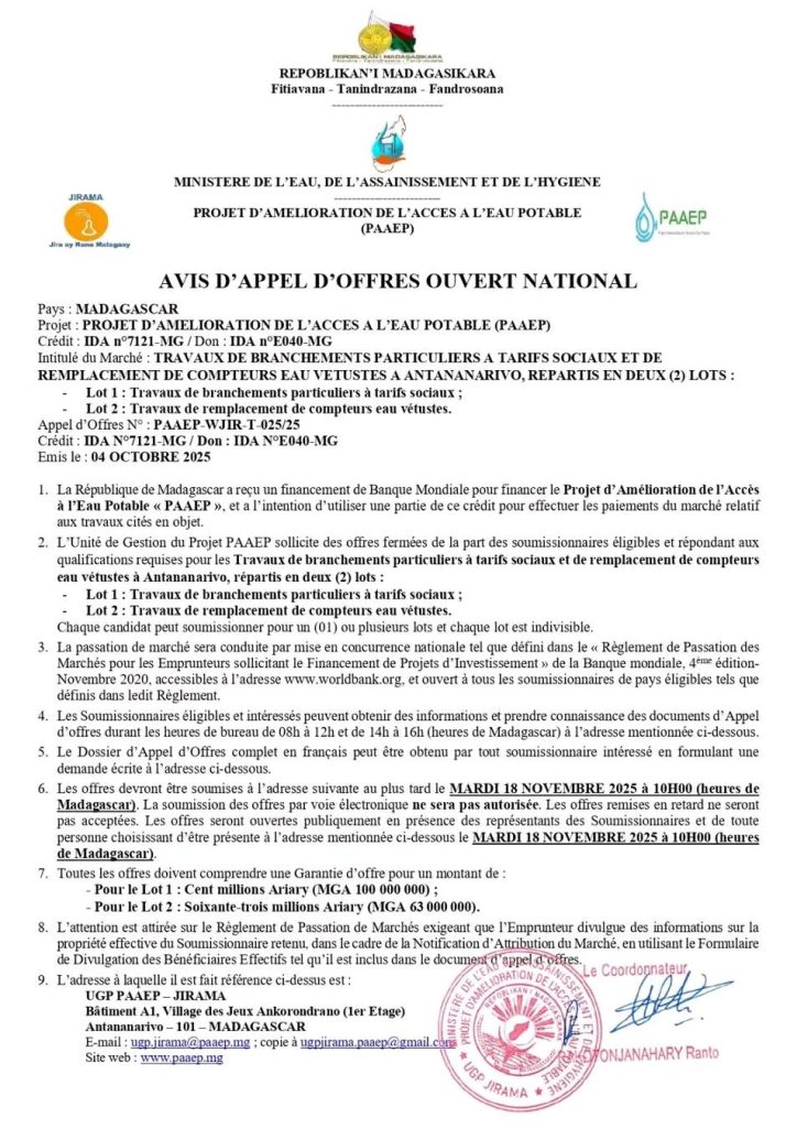 Date limite des dépôts de candidatures : Mardi 18 Novembre à 10H00 (Heures de Madagascar)