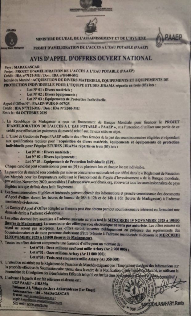 Date limite des dépôts de candidatures : Mercredi 19 Novembre à 10H00 (Heures de Madagascar)