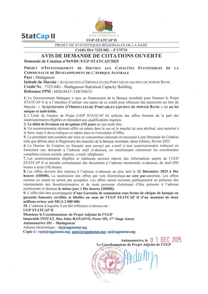 Demande de Cotation 𝐧°𝟎𝟏𝟗/𝐃𝐂/𝐔𝐆𝐏 𝐒𝐓𝐀𝐓𝐂𝐀𝐏/𝟐𝟎𝟐𝟓