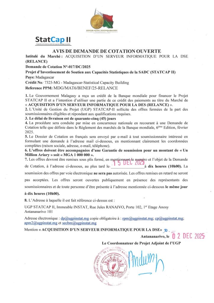 AVIS DE DEMANDE DE COTATION OUVERTE : ACQUISITION D’UN SERVEUR INFORMATIQUE POUR LA DSE (RELANCE)