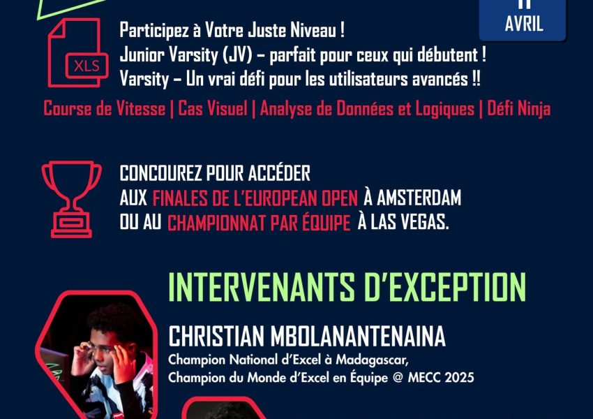 Date et Heure : Samedi 11 Avril 2026 dès 10H30 Lieu : INSCAE 67Ha – Amphithéâtre, Antananarivo Prix : À propos de l’événement : 𝗘𝘅𝗰𝗲𝗹 & 𝗚𝗮𝗺𝗶𝗻𝗴 – 𝗗𝗲𝘃𝗲𝗻𝗲𝘇 𝗺𝗲𝗶𝗹𝗹𝗲𝘂𝗿 𝗲𝗻 𝗘𝘅𝗰𝗲𝗹… 𝘀𝗮𝗻𝘀 𝘃𝗼𝘂𝘀 𝗲𝗻 𝗿𝗲𝗻𝗱𝗿𝗲 𝗰𝗼𝗺𝗽𝘁𝗲 ! Que vous