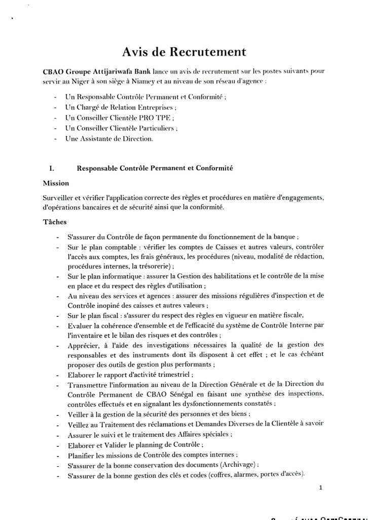 CBAO Groupe Attijariwafa Bank lance un avis de recrutement sur les postes suivants pour servir au Niger à son siège à Niamey et au niveau de son réseau d’agence: