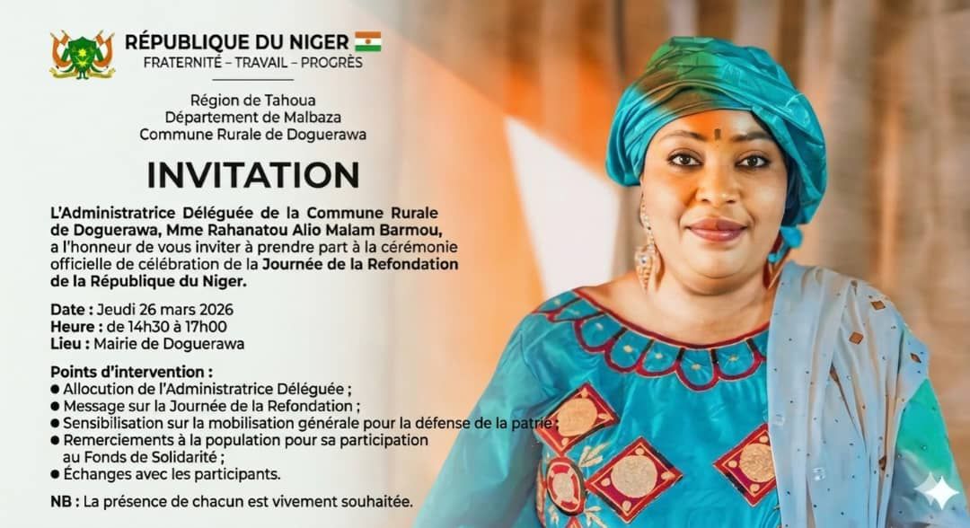 La Commune Rurale de Dogueraoua dans la région de Tahoua, vous invite à prendre part à la cérémonie officielle de célébration de la Journée de la Refondation Nationale. Cette importante manifestation se tiendra le jeudi 26 mars 2026, de 14h30 à 17h00, à la Mairie de Dogueraoua