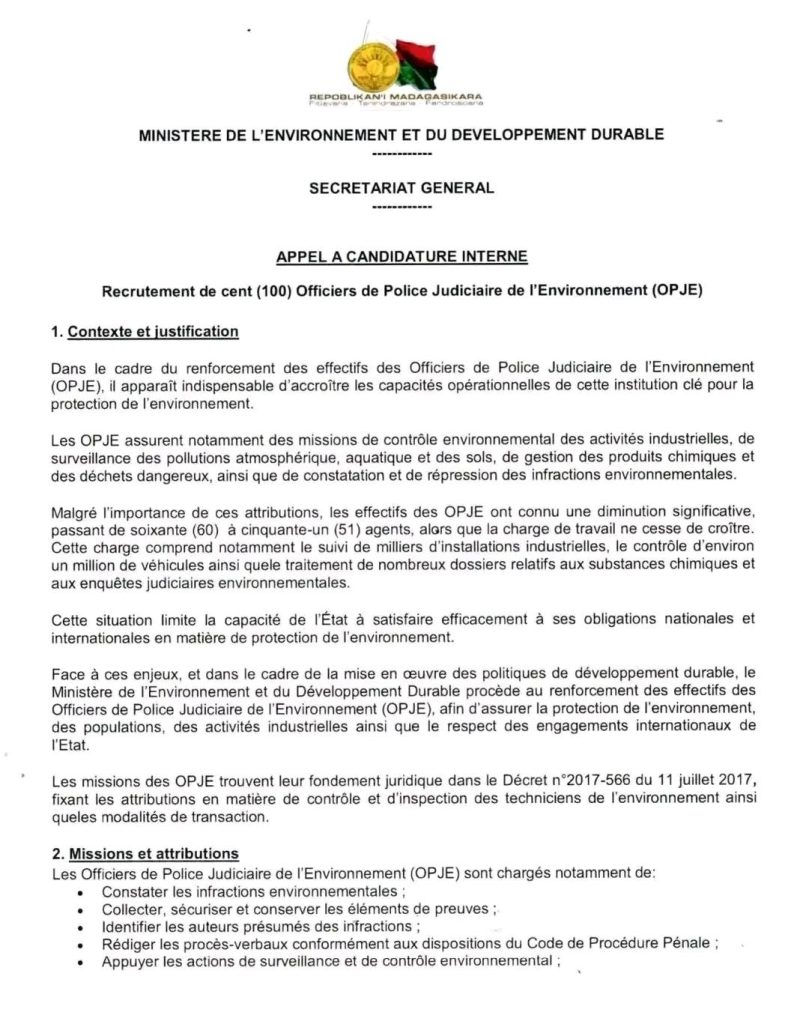 💚🫴‎[RECRUTEMENT INTERNE] – OFFICIER DE POLICE JUDICIAIRE DE L’ENVIRONNEMENT (OPJE) 🌳🇲🇬