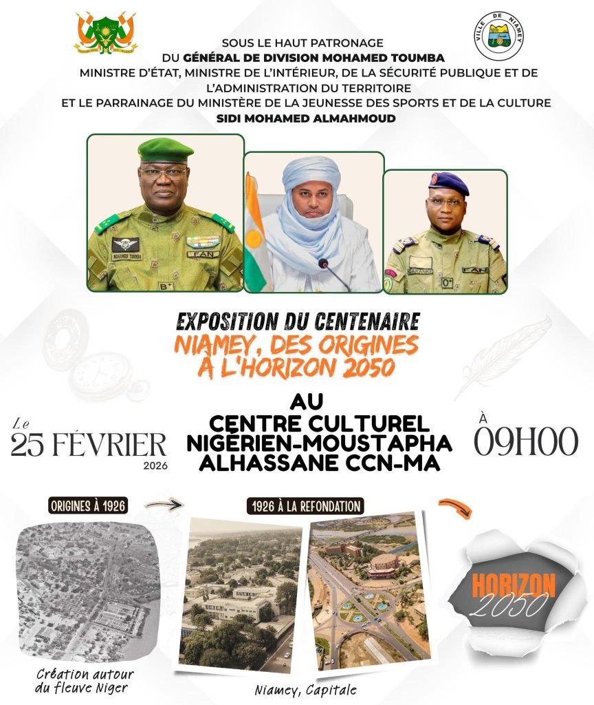 Dans le cadre de la célébration des festivités commémoratives du centenaire de la capitale Niamey, la Ville de Niamey procédera à l’ouverture officielle de l’exposition du centenaire, placée sous le thème « Niamey, des origines à l’horizon 2050 » le 25 février 2026, au Centre Culturel Nigérien Moustapha Alhassane.