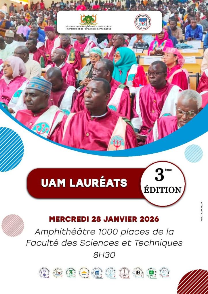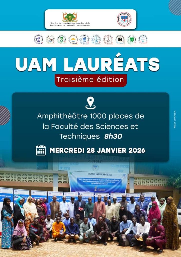 Bonjour à toutes et à tous. Votre cérémonie UAM Lauréats 3e édition est en route. Vous êtes cordialement invités à noter ce grand Rendez-vous dans vos agendas. C’est pour le mercredi 28 janvier 2026 à l’université Abdou Moumouni de Niamey. Nous savons compter sur votre forte mobilisation pour célébrer vos lauréats. Merci. PCO