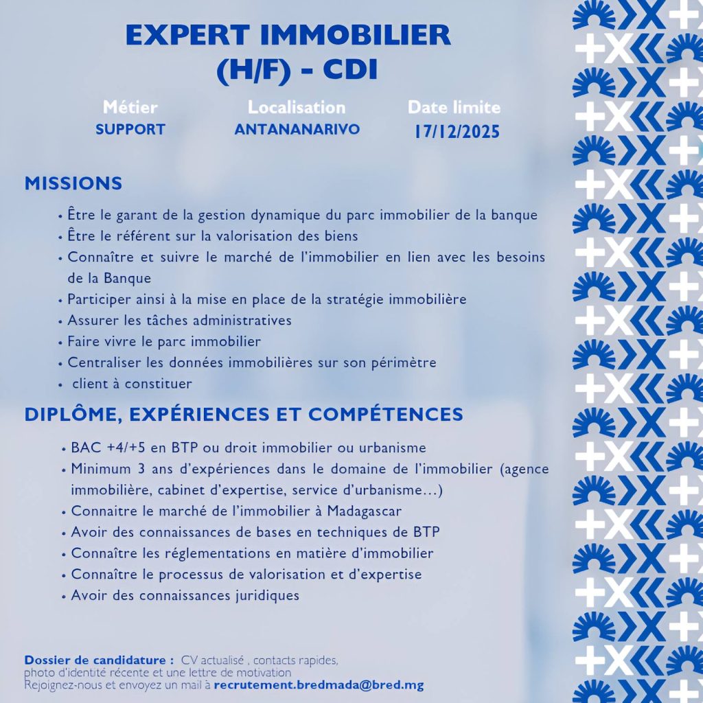 📩 Rejoignez-nous en envoyant votre candidature à l’adresse recrutement.bredmada@bred.mg