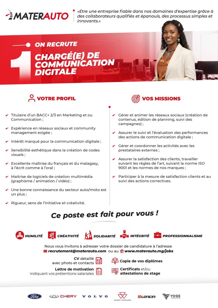 Dans le cadre du renforcement de ses activités, MATERAUTO recrute :