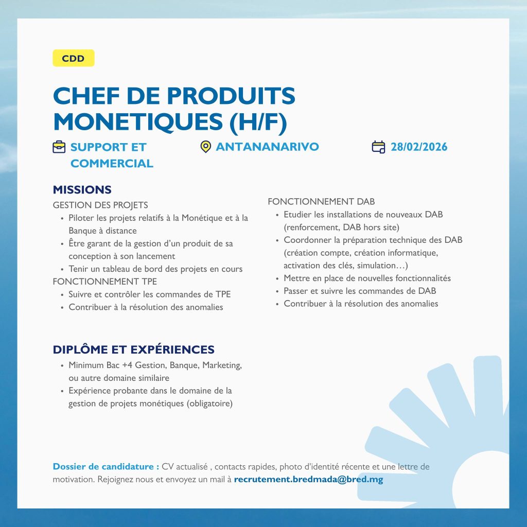 📩 Rejoignez-nous dès aujourd’hui en envoyant votre candidature à : recrutement.bredmada@bred.mg
