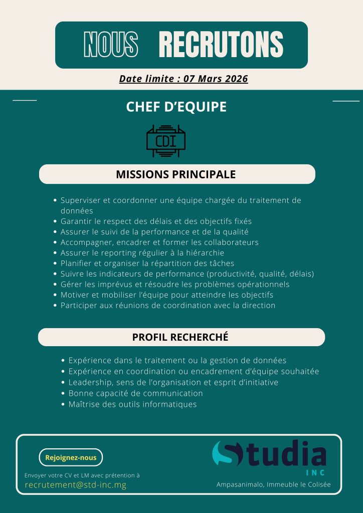Studia Inc recrute un(e) Chef d’Équipe pour piloter ses équipes de traitement de données.