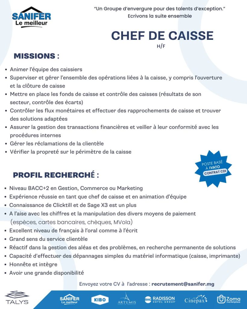 Envoyez vos candidatures à : recrutement@sanifer.mg