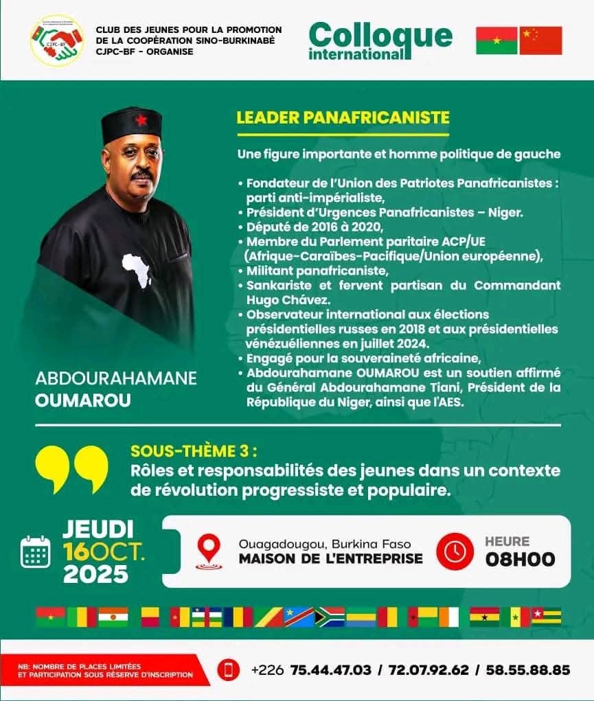 Ce jeudi 16 octobre 2025 à 08h00, j’aurai l’honneur de co-animer une conférence majeure à la Maison de l’Entreprise, dans le cadre du Colloque International sur la coopération Sino-Burkinabè.