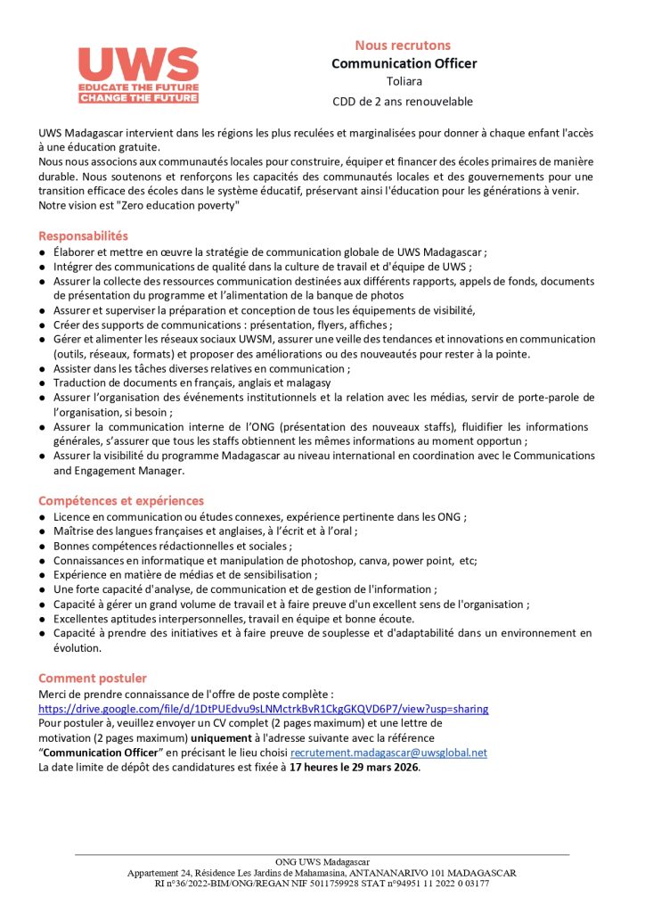 #Recrutement#ONG#Madagascar#Education#UWS