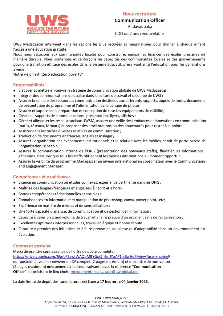 Dans le cadre du renforcement de notre équipe à Madagascar, UWS Madagascar recrute plusieurs profils engagés et motivés :