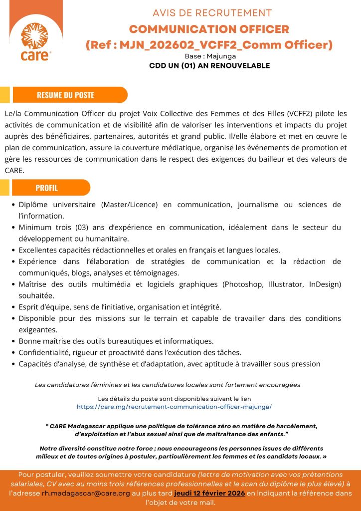 Comment postuler ? Envoyez votre dossier de candidature complet à l’adresse : rh.madagascar@care.org, incluant :
