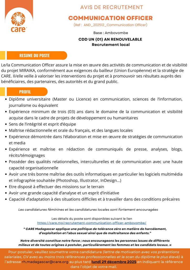 Le projet MIRAIKA de CARE Madagascar renforce son équipe et lance le recrutement de nouveaux collaborateurs :