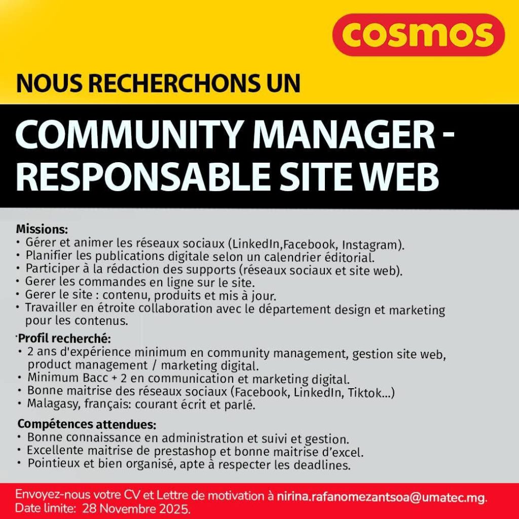 Envoyez-nous votre CV et votre lettre de motivation à nirina.rafanomezantsoa@umatec.mg avant le 28 novembre 2025