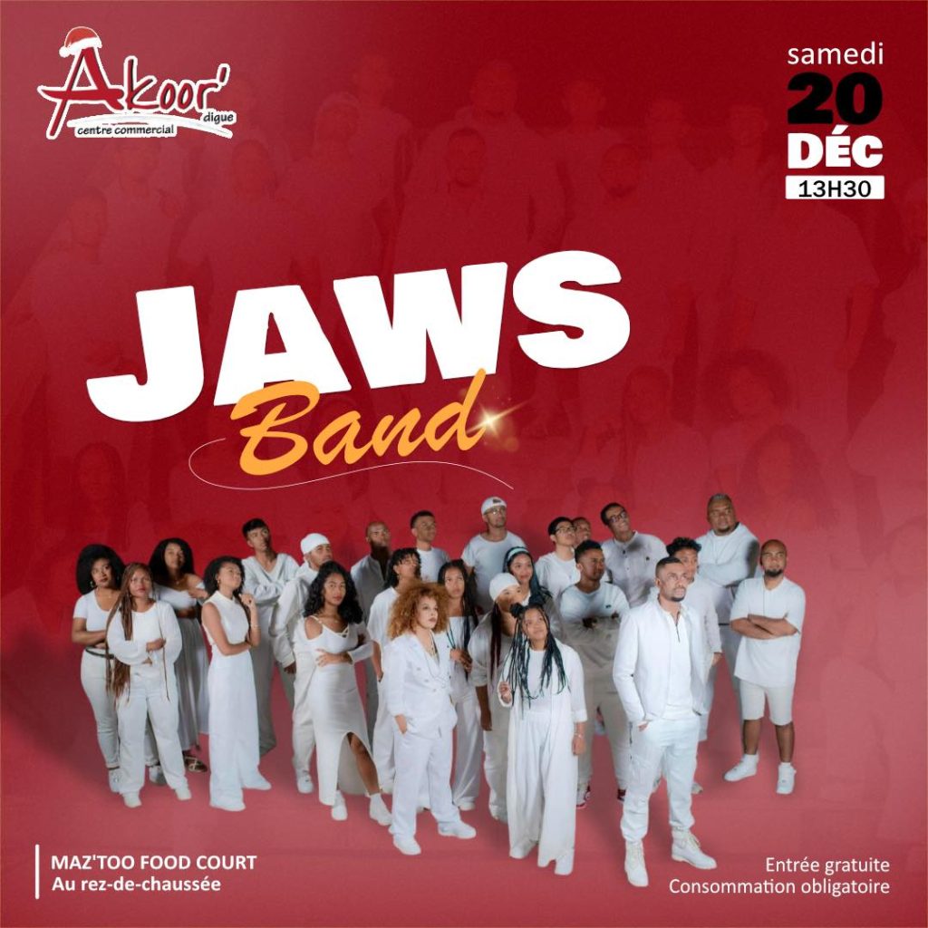 Ce samedi 20 décembre, on va chanter, danser et partager la bonne humeur🥰 avec JAWS BAND au centre commercial Akoor Digue à partir de 13h30 !😉