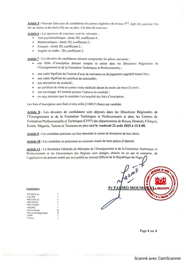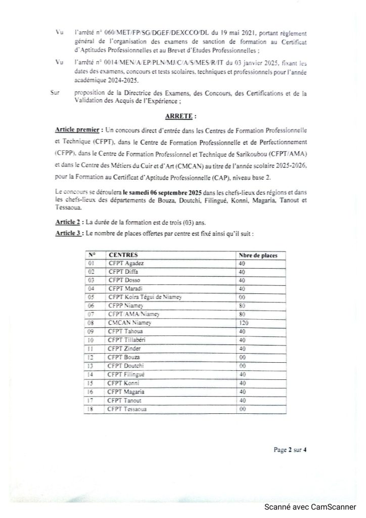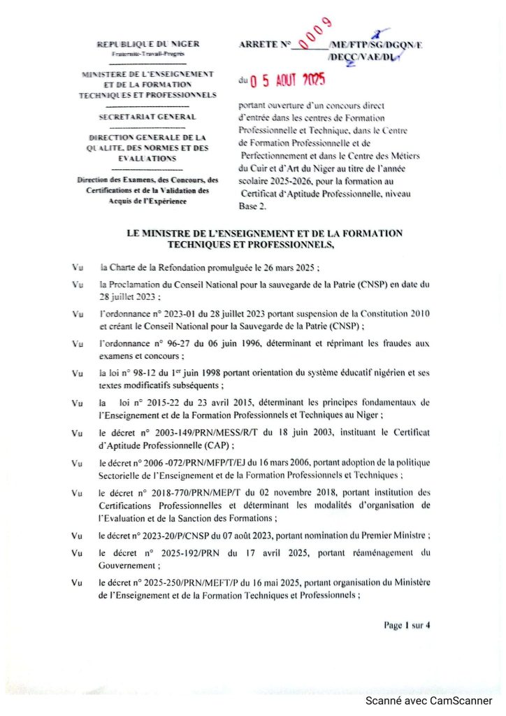 Concours direct d’entrée dans les centres de Formation Professionnelle et Technique, dans le Centre de Formation Professionnelle et de Perfectionnement et dans le Centre des Métiers du Cuir et d’Art du Niger au titre de l’année scolaire 2025-2026, pour la formation au Certificat d’Aptitude Professionnelle, niveau Base 2.