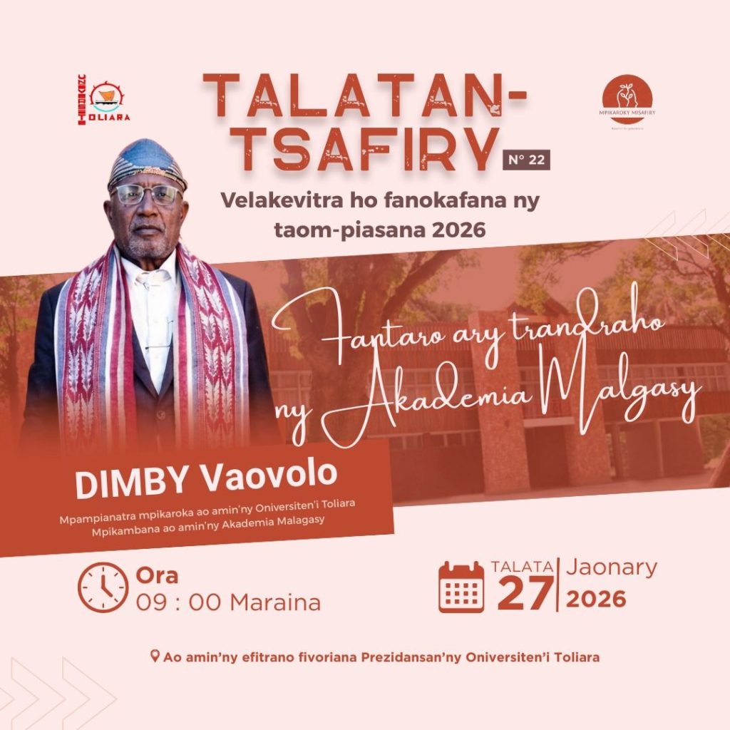 ✅Ho fanokafana ny talatan-tsafiry ho an’ny taom-piasana 2026, izay karakarain’ny Mpikaroky Misafiry sy ny Oniverisiten’i Toliara, dia hisy velakevitra miavaka hotanterahina ao amin’ny efitrano malalaka fivoriana ao amin’ny prezidansan’ny Oniversite ny talata 27 janoary ho avy izao.