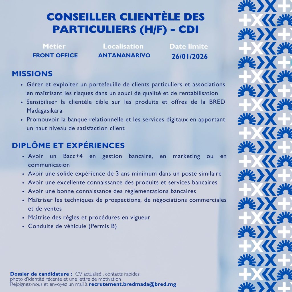 Rejoignez-nous en envoyant votre candidature à l’adresse recrutement.bredmada@bred.mg