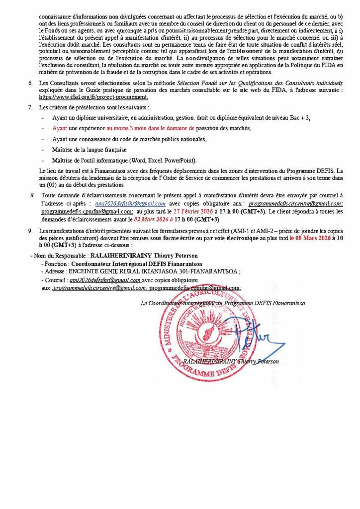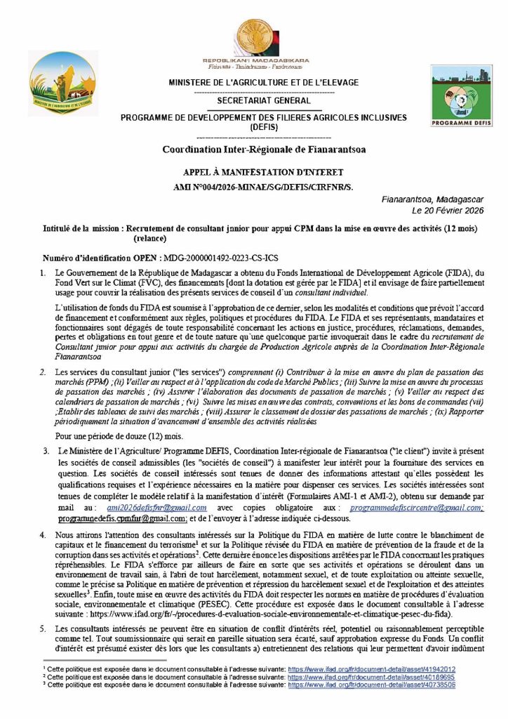 #EmploiJeunes#Recrutement#Fianarantsoa#ProgrammeDEFIS#Junior#Gestion#MarchésPublics#FIDA#PremierEmploi#Madagascar#FIDA